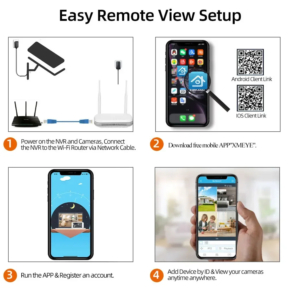 Easy setting , just 4 steps for mobile phone viewing,View live video of the system from anywhere and anytime via you smart phone, table or PC with advanced P2P technology, you are able to remote access your system in minutes or less, no portforwarding needed, remote access has never been so easy!!!