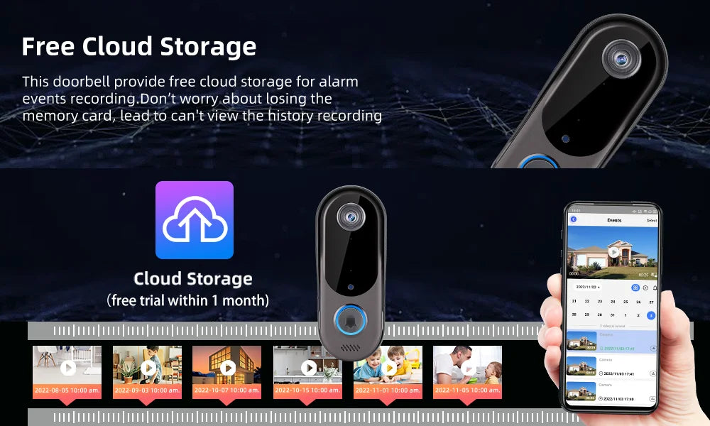 This doorbell provide 1 month free cloud storage for alarm events recording. Don’t worry about losing the memory card and not being able to view the history recording.(NOTE: After 1 month, you need to pay for the cloud service to use cloud)